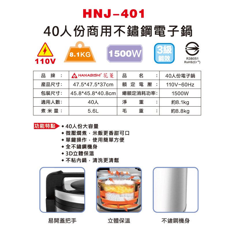 花菱40人份商用電子鍋 110V/60Hz/1500W